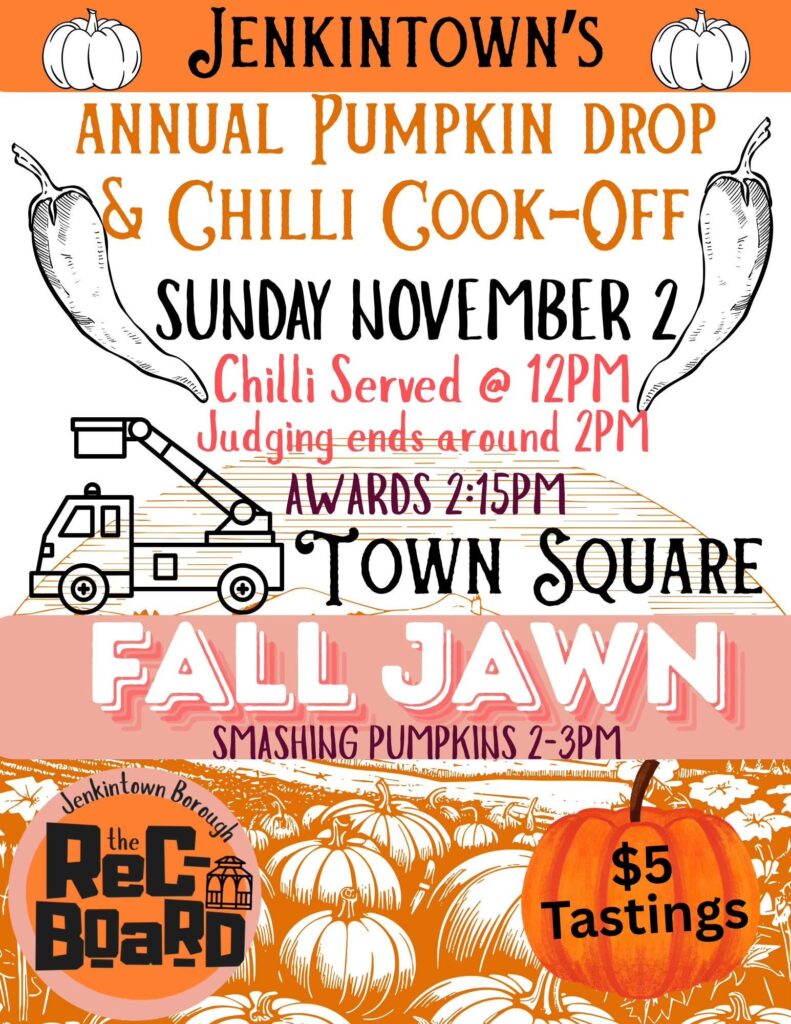 Jenkintown Borough’s Recreation Board will host its annual Pumpkin Drop & Chili Cook-off at Town Square on Sunday, November 2.