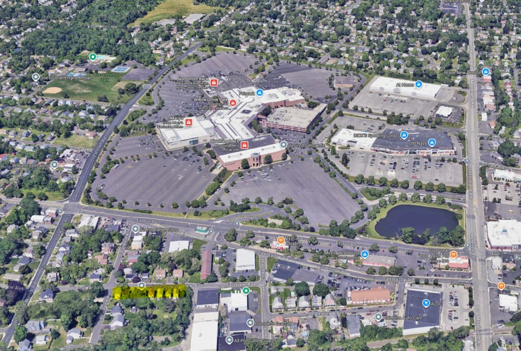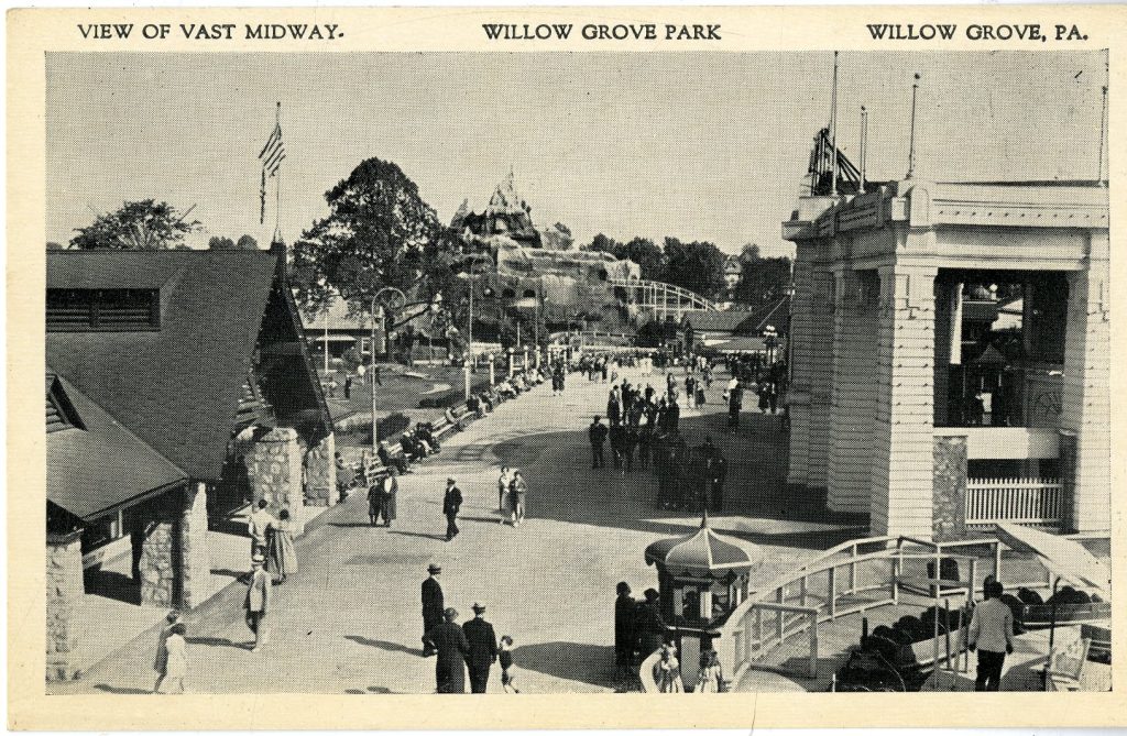 A 1926 aerial view of Willow Grove Park. From the previous images of Keswick Village, the Trolley (Route 6) began in Philadelphia and ended here at the park. The trolley ran through around 1954. The Google Maps screen shot approximates the view today. I highlighted the 8 clearly visible houses in the 1926 image on the modern image for reference.