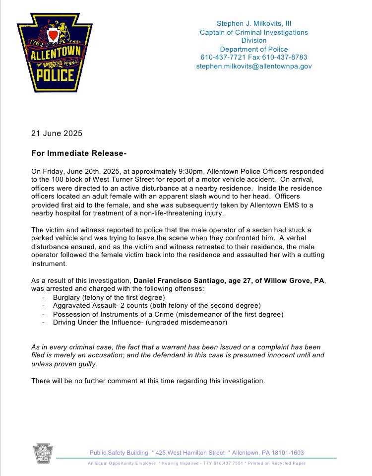 Daniel Francisco Santiago, 27, of Willow Grove (Upper Moreland Township) has been accused of driving under the influence of alcohol when he struck a parked car and then stabbed a woman who attempted to stop him from fleeing on Friday, June 20, the Allentown Police Department announced in a press release.